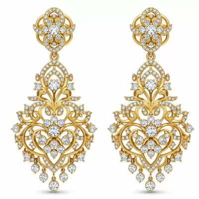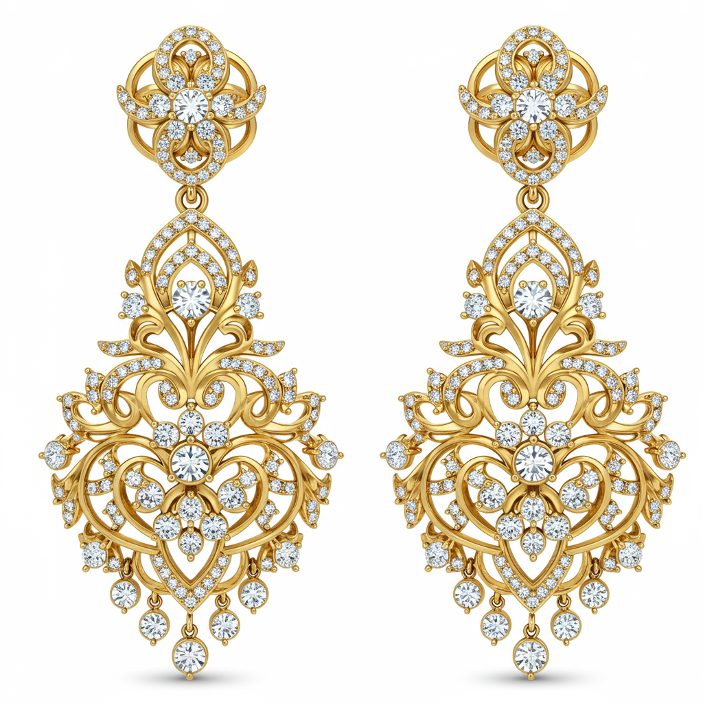 These exquisite heavy bridal earrings are a masterpiece of traditional design fused with modern precision. Crafted in opulent 18KT yellow gold, they feature cascading diamond links forming an impressive chandelier silhouette. Totaling 5.80 carats of brilliant VVS diamonds, these earrings capture and reflect light dramatically, ensuring a show-stopping presence. Perfect for the main wedding ceremony or grand reception, they represent ultimate luxury and heritage.
