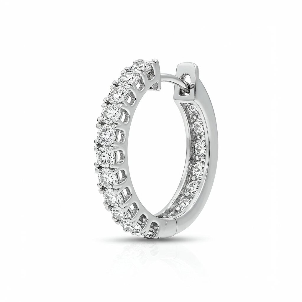 These sophisticated huggie earrings wrap the lobe in a seamless stream of brilliant diamonds, epitomizing modern elegance. Crafted in radiant 18KT white gold, the delicate pave setting maximizes sparkle while maintaining a comfortable, lightweight profile. Their secure hinged closure makes them perfect for daily wear or layering with other studs. This timeless design offers understated luxury and exceptional versatility.