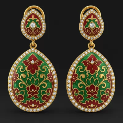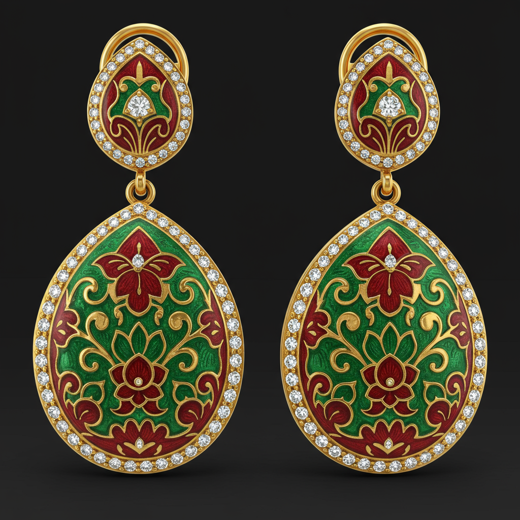 These exquisite Meenakari drop earrings are a testament to traditional Indian artistry, crafted in lustrous 18KT yellow gold. The intricate enamel work showcases vibrant floral patterns, meticulously hand-painted by skilled artisans. Dazzling pave-set diamonds outline the delicate frame, adding a touch of contemporary brilliance to the heritage design. Perfect for formal events, these earrings offer a captivating blend of cultural richness and sophisticated luxury.