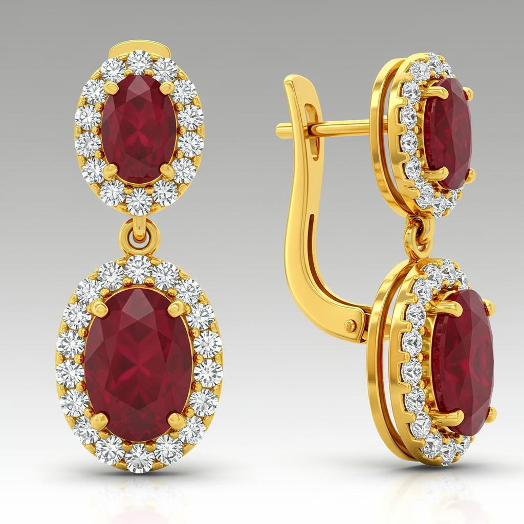 These exquisite ruby and gold drop earrings capture timeless elegance with their vibrant color and brilliant sparkle. Featuring deep red oval rubies securely nestled beneath a sparkling pave diamond halo, they offer a stunning visual contrast. Crafted in lustrous 18KT yellow gold, the delicate articulation allows the stones to maximize light reflection. This pair is perfect for adding a touch of passionate luxury and sophisticated color to any formal attire.