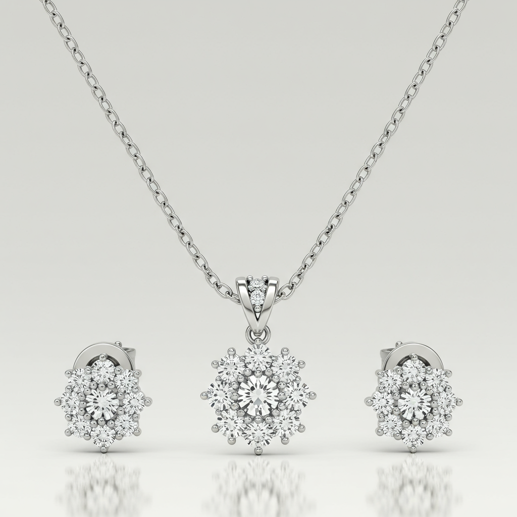 A three-piece ensemble crafted for undeniable elegance. This set features a delicate pendant necklace and matching stud earrings, all meticulously fashioned in lustrous 18KT white gold. Each piece is adorned with brilliant round-cut diamonds set to maximize scintillation and light performance. This timeless collection offers refined sophistication, perfect for both daily wear and grand evening events.