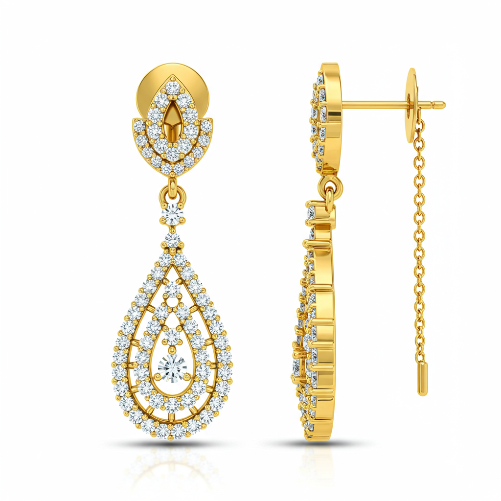 These exquisite Sui Dhaga earrings offer modern elegance combined with traditional grace. Crafted in radiant 18KT yellow gold, the delicate chain silhouette threads effortlessly through the ear, culminating in a shimmering cluster of pave-set diamonds. This design provides dynamic movement and captures light beautifully, ensuring a sophisticated statement for any occasion. They are the perfect blend of minimalist style and luxurious sparkle.
