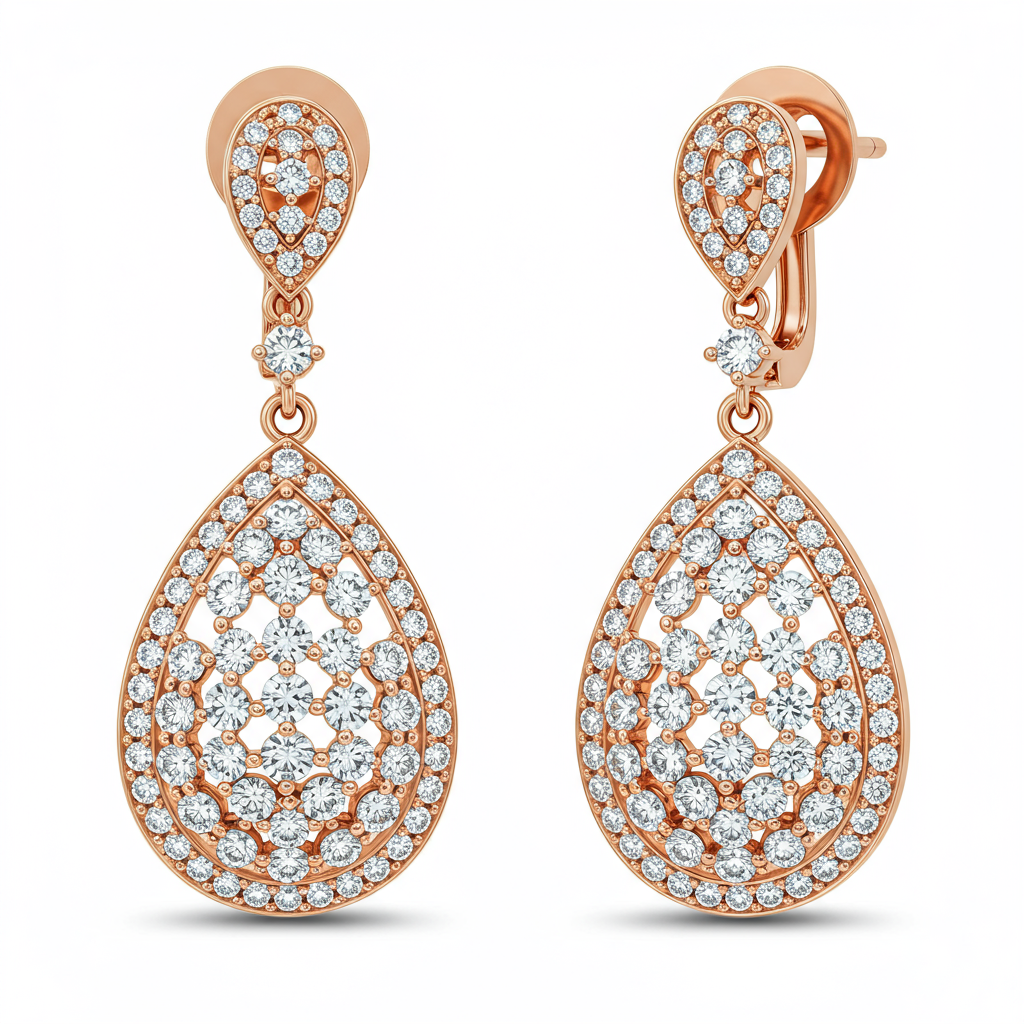 These exquisite 18KT rose gold earrings blend contemporary curves with timeless brilliance. Featuring a delicate drop design, the surface is meticulously adorned with micro-pave set VVS diamonds. The warm hue of the rose gold beautifully contrasts the icy fire of the stones, ensuring maximum sparkle. Perfect for both sophisticated day wear and glamorous evening events, they offer an unmistakable statement of luxury and refinement.