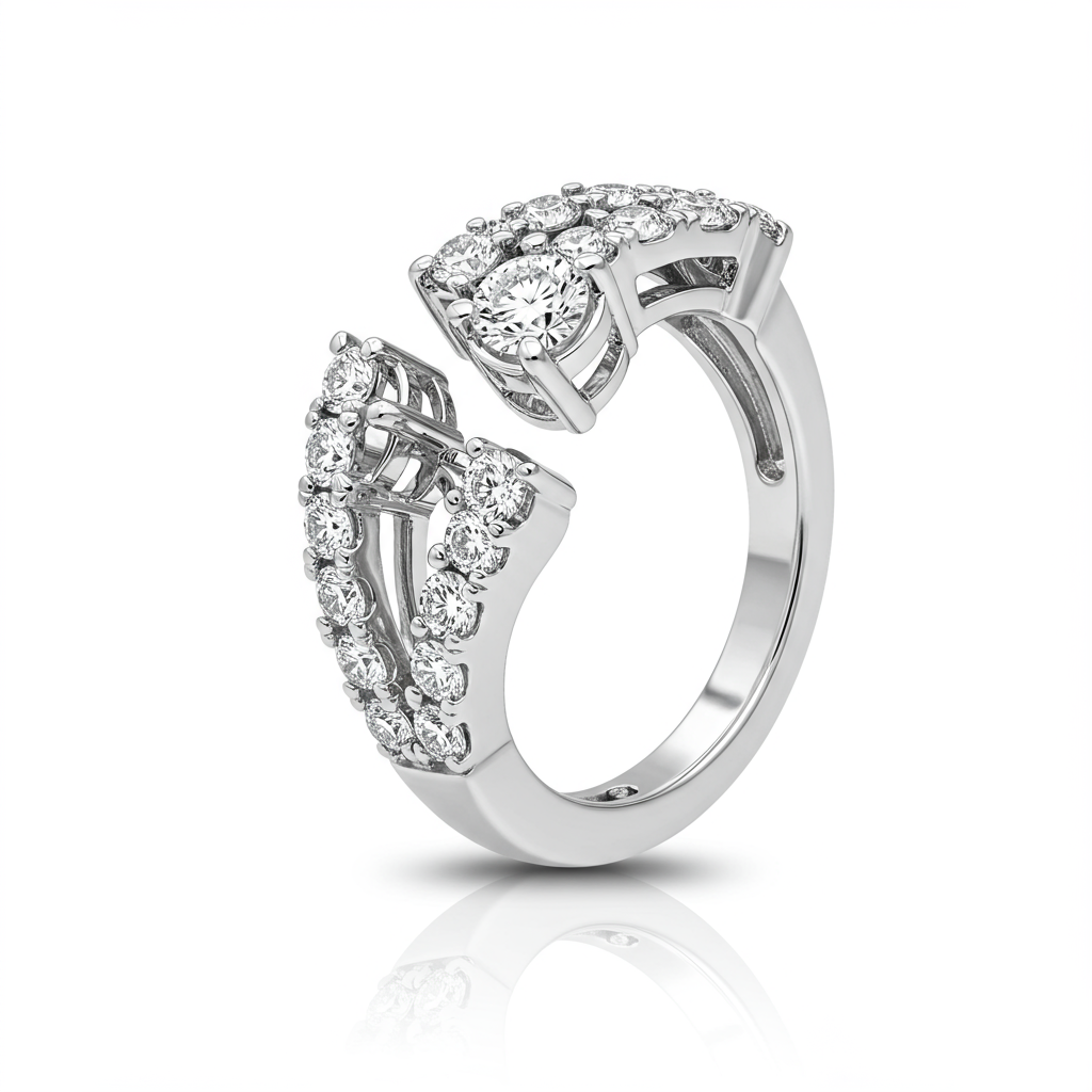The 'earring ring model' represents the pinnacle of innovative luxury, offering stunning versatility in a single design. Expertly crafted in 18KT white gold, this piece seamlessly transitions between a sophisticated diamond hoop earring and a bold, elegant statement ring. It is meticulously adorned with VVS diamonds that capture and reflect light with exceptional brilliance. This creation is designed for the discerning individual who demands both adaptable styling and uncompromising high quality. Its modular design makes it a truly unique addition to any high jewelry collection.