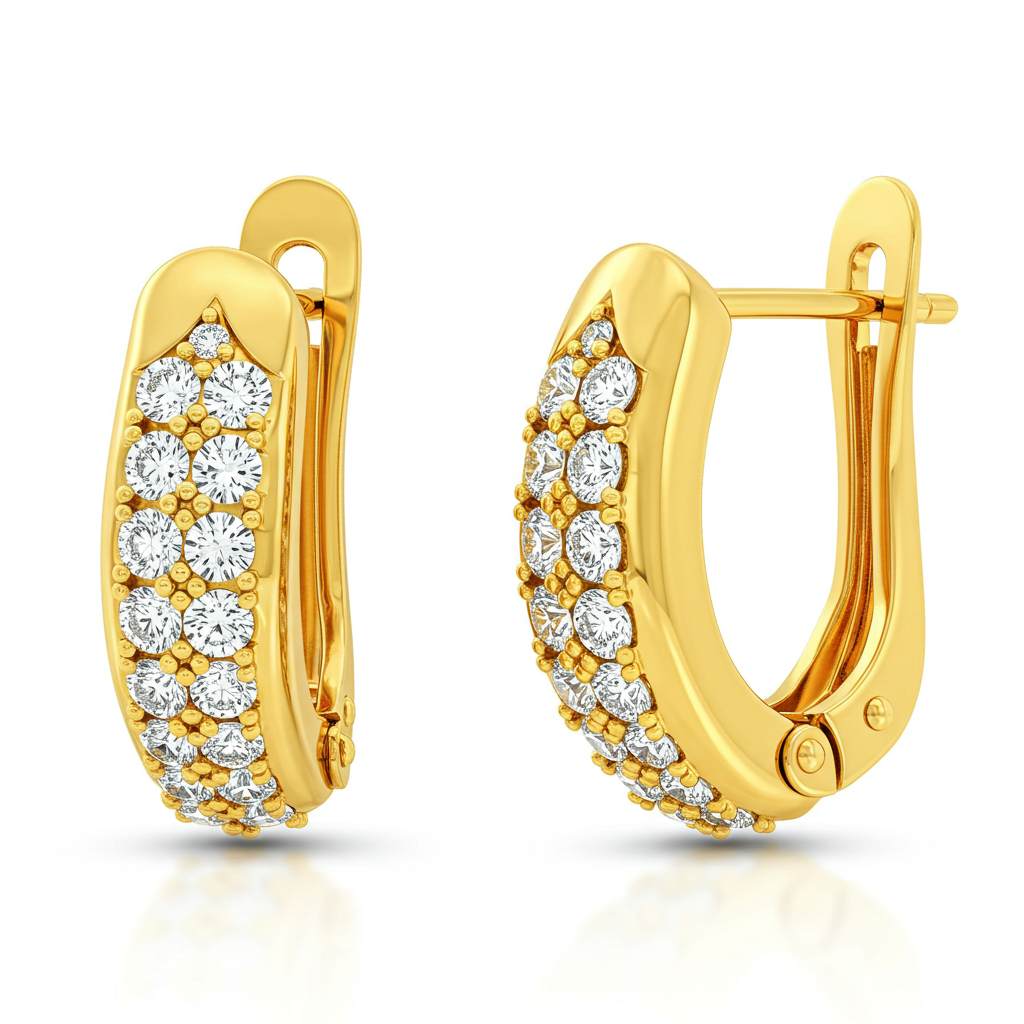 These exquisite Gold Bali Earrings blend classic Indian design with contemporary elegance. Crafted in radiant 18KT yellow gold, the delicate hoop features meticulous diamond setting along the front facing curve. They offer lightweight comfort and secure hinge closure, making them perfect for daily wear or sophisticated evening events. This design symbolizes timeless beauty and adds a subtle yet noticeable sparkle to any ensemble.