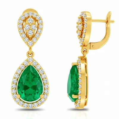 These exquisite 18KT yellow gold drop earrings feature a captivating arrangement centered around two vibrant, pear-cut natural emeralds. The rich green gems are flawlessly framed by a shimmering halo of VVS round brilliant diamonds, enhancing their exceptional color saturation. Designed for elegant movement, these earrings catch the light beautifully from every angle. They represent a perfect marriage of classic luxury and contemporary sophistication, making them ideal for grand occasions.