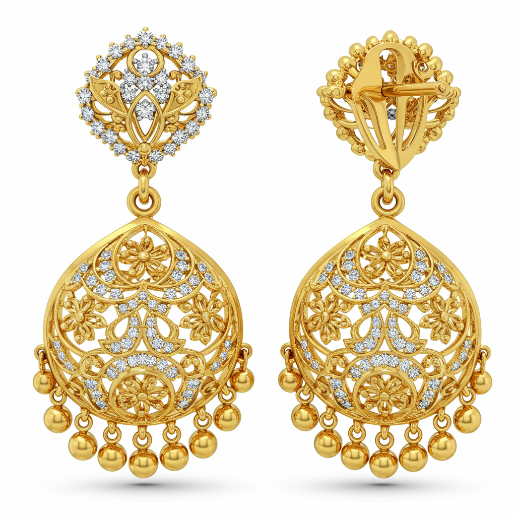These exquisite Indian Chandbali earrings are a testament to heritage craftsmanship, featuring sweeping arcs of 18KT yellow gold meticulously set with brilliant-cut diamonds. Inspired by the crescent moon, the design dangles gracefully, capturing light with every movement. A stunning central emerald drop provides a vibrant focal point, enhancing the opulent, festive appeal of the piece. Perfect for grand occasions, these earrings blend timeless tradition with unmatched diamond brilliance.