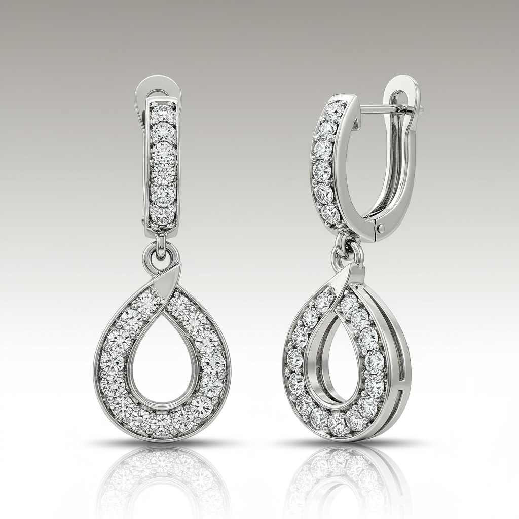 These exquisite Korean-style drop earrings embody subtle elegance and contemporary design. Crafted in luminous 18KT white gold, their fluid silhouette catches the light beautifully, creating movement and grace. A central row of precision-set VVS diamonds adds a brilliant sparkle, perfect for transitioning effortlessly from daywear to evening glamour. This sophisticated accessory is a testament to minimalist luxury and refined craftsmanship.