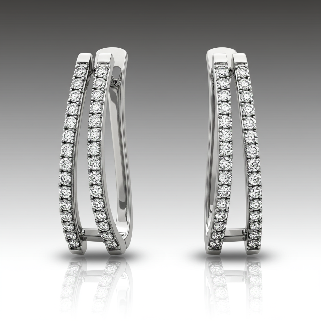 The 'LED Earrings' redefine modern luxury with their dynamic, architectural design. Featuring dual parallel rows of meticulously set VVS diamonds, these earrings capture and reflect light with exceptional brilliance. Crafted in premium 18KT white gold, the clean lines offer a contemporary aesthetic suitable for gala events or exclusive evenings. These statement pieces are engineered for comfort and lasting elegance, ensuring they become a treasured addition to any collection.
