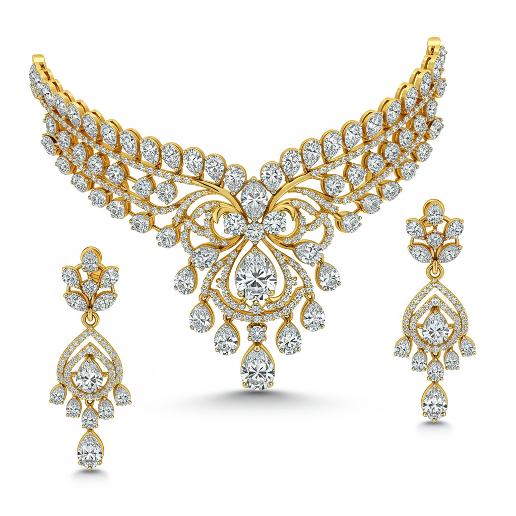 This opulent bridal jewelry set combines a majestic Maang Tikka and coordinated Dangle Earrings, designed to command attention. Expertly crafted in 18KT Yellow Gold, the pieces feature intricate filigree work studded with brilliant VVS diamonds. The design balances traditional Indian aesthetics with contemporary finesse, providing a breathtaking sparkle that illuminates the wearer's face. This set is the ultimate statement of luxury and heritage for any grand event.