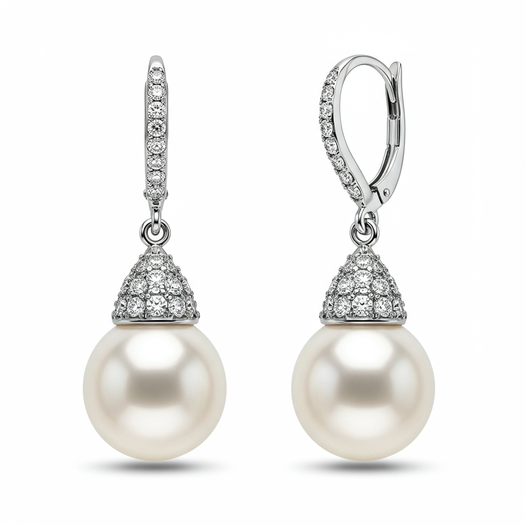 These original pearl earrings epitomize timeless elegance and modern craftsmanship. Each piece features a lustrous, perfectly spherical cultured pearl suspended below a delicate setting of brilliant round diamonds. Crafted in radiant 18KT white gold, the subtle sparkle enhances the natural glow of the pearl, creating a look of refined luxury. They are the ideal accessory for formal events or adding sophistication to everyday wear, designed to be cherished for a lifetime.