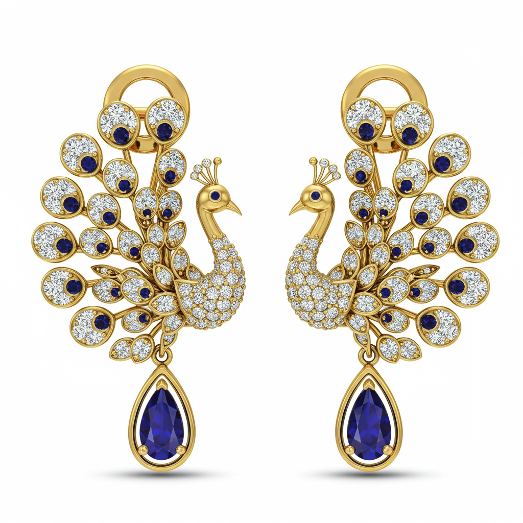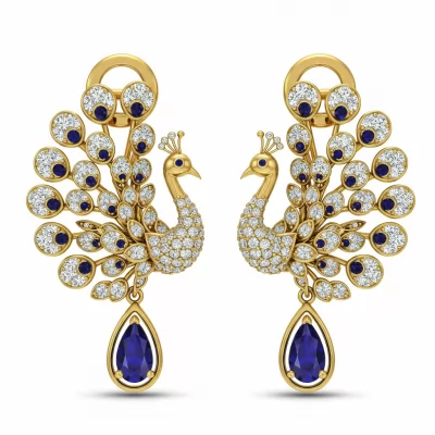 These stunning 18KT gold peacock earrings capture the majestic beauty of the avian world through intricate design. Intricately sculpted feathers are micro-pave set with brilliant VVS diamonds, maximizing sparkle and luminescence. The elegant, oversized drop silhouette ensures graceful movement, symbolizing luxury and refinement. Perfect for gala events or adding a grand statement of artistry to any ensemble, these earrings are a true testament to masterful craftsmanship.