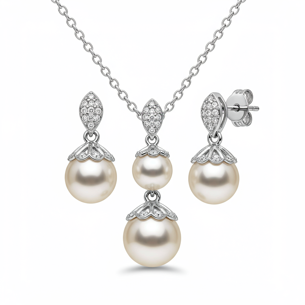 This exquisite set combines timeless grace with contemporary sparkle, featuring a delicate pendant and matching drop earrings. Each piece showcases a perfectly round, lustrous cultured pearl suspended from an intricate diamond-pave setting. Crafted in radiant 18KT white gold, the brilliant VVS accent diamonds catch the light beautifully, enhancing the pearl's natural glow. This set is the ultimate statement of sophisticated elegance, ideal for bridal wear or black-tie events.