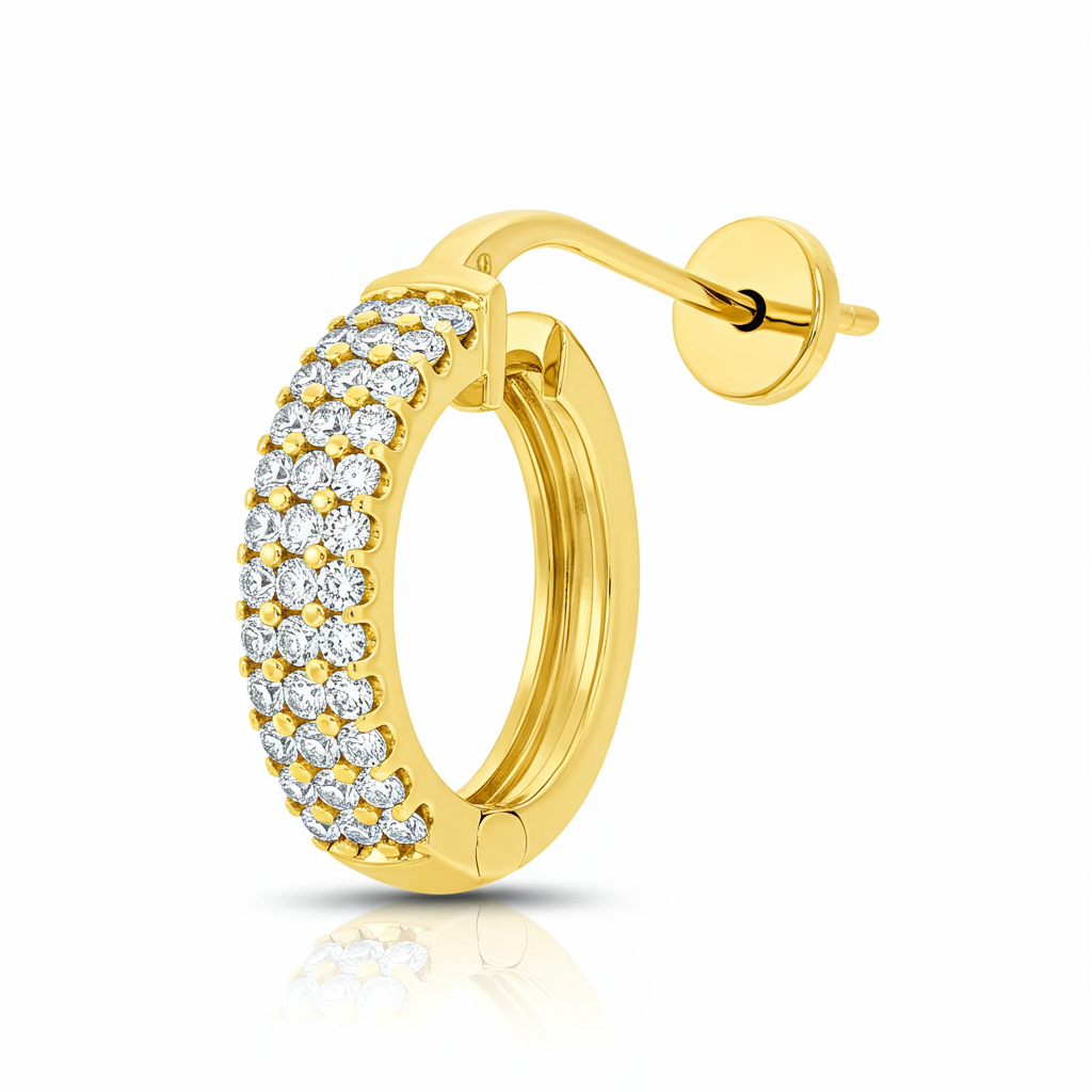 These exquisite hoop earrings redefine everyday luxury, crafted in radiant 18KT yellow gold. The secure, hinged closure ensures comfort and stability for all-day wear. Each piece is meticulously set with brilliant-cut diamonds across the front surface, catching the light with every movement. A timeless design, these 'ring type' hoops offer exceptional sophistication and brilliance, making them an essential addition to any refined collection.