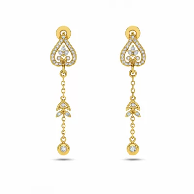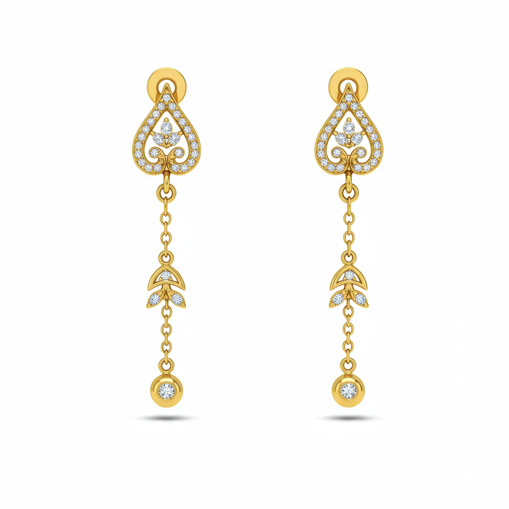 These sophisticated Sui Dhaga earrings offer a modern take on traditional elegance. Crafted in brilliant 18KT gold, the delicate threading design is accented by a seamless flow of brilliant VVS diamonds. The sleek, elongated silhouette creates a mesmerizing movement that beautifully catches the light. Perfect for adding a touch of understated glamour to any ensemble, these earrings exemplify minimalist luxury and intricate design. This piece combines high fashion appeal with expert artisanal craftsmanship.