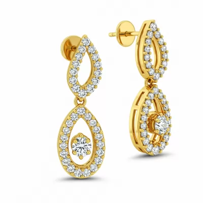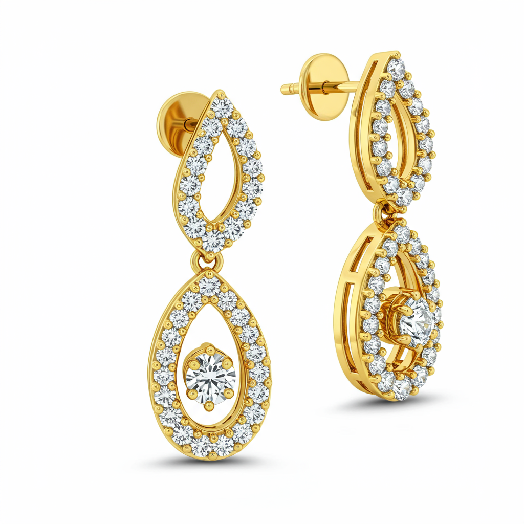 These exquisite drop earrings, inspired by Tanishq's legacy, capture modern luxury in a lightweight design. Crafted in luminous 18KT yellow gold, they feature a delicate, flowing silhouette that catches the light beautifully. The earrings are adorned with meticulously set brilliant-cut diamonds, providing exceptional sparkle and fire. They are the perfect accessory for both professional settings and elegant evening wear, offering timeless sophistication and excellent value.