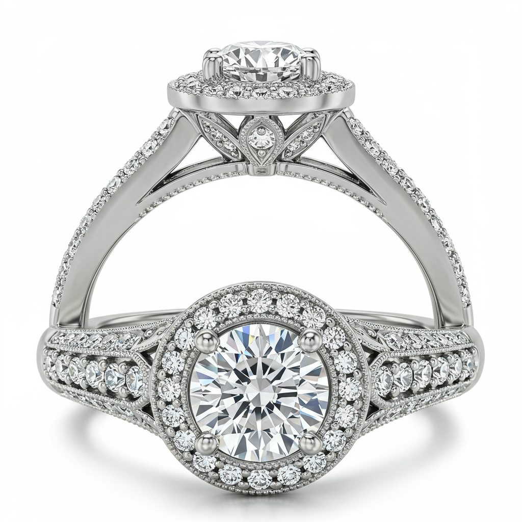 This exquisite antique-style engagement ring features a stunning 1.05 carat brilliant-cut diamond embraced by a finely crafted halo of micropavé accents. The 18KT white gold band is detailed with intricate milgrain edging and subtle filigree work, evoking timeless Edwardian elegance. This piece captures the romantic artistry of bygone eras, making it a perfect heirloom for modern commitment. It offers superior sparkle with VVS clarity stones and a substantial feel of luxury.