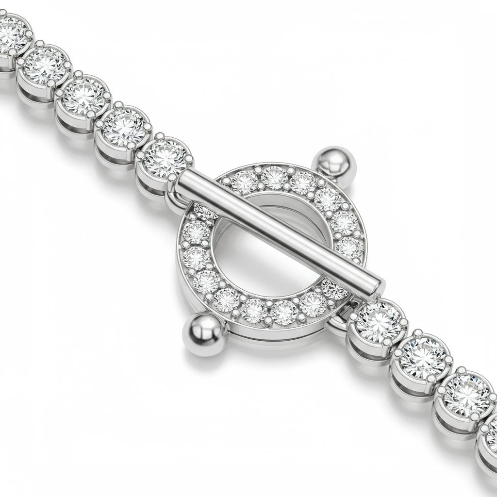The Tiffanys-style toggle bracelet embodies timeless elegance and modern craftsmanship. Crafted in luminous 18KT white gold, this piece features a brilliant, oversized toggle clasp accented with micro-pave diamonds. Its delicate yet secure chain drapes gracefully around the wrist, offering both sophistication and comfort. This bracelet is an essential statement piece, designed to transition seamlessly from daywear elegance to evening glamour.